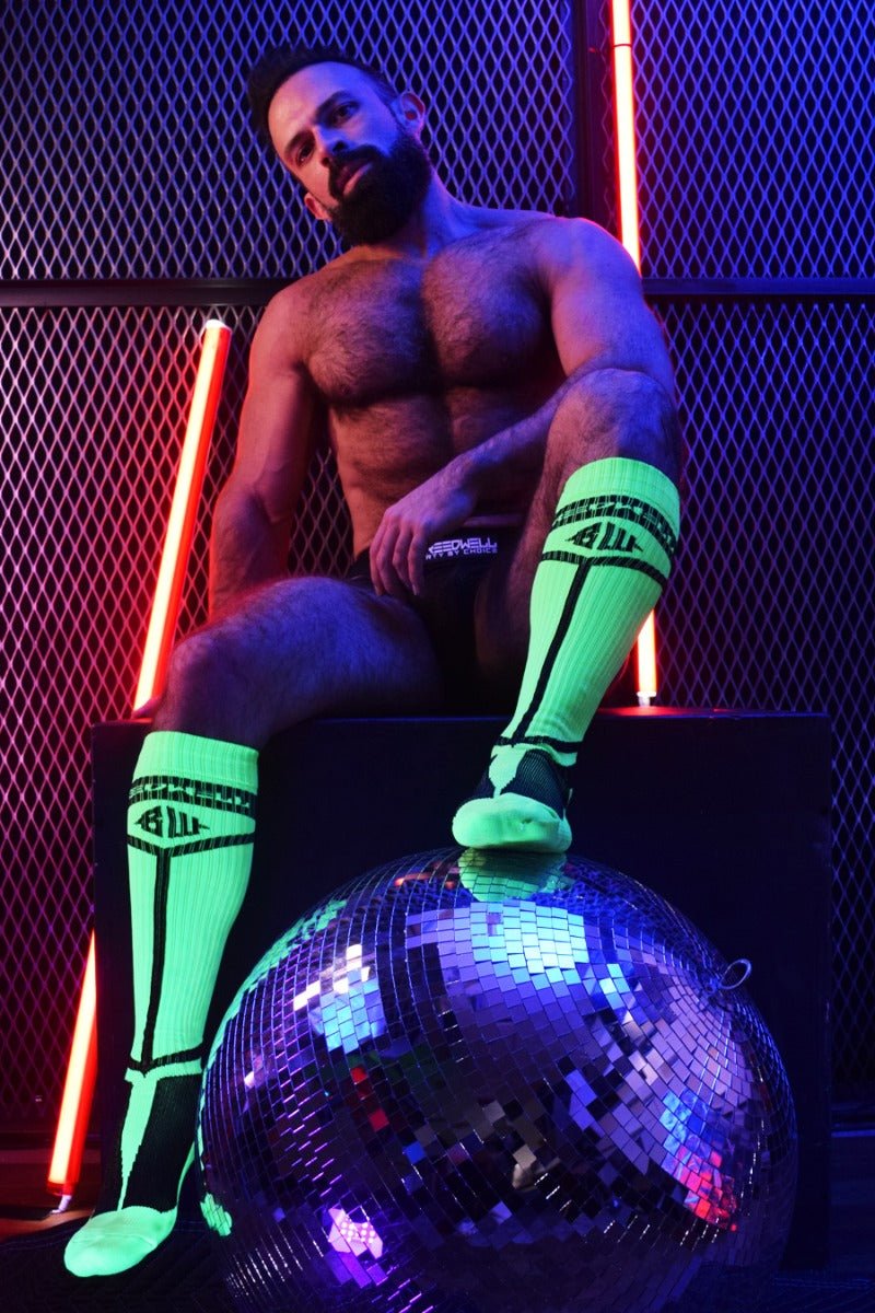 We love men from their heads to their toes and everything in between. Everything. In this case, it’s the Breedwell Hybred Sock Neon Green, which celebrates calves with an angled design, bold logo details, and innovative one-of-a-kind line details.