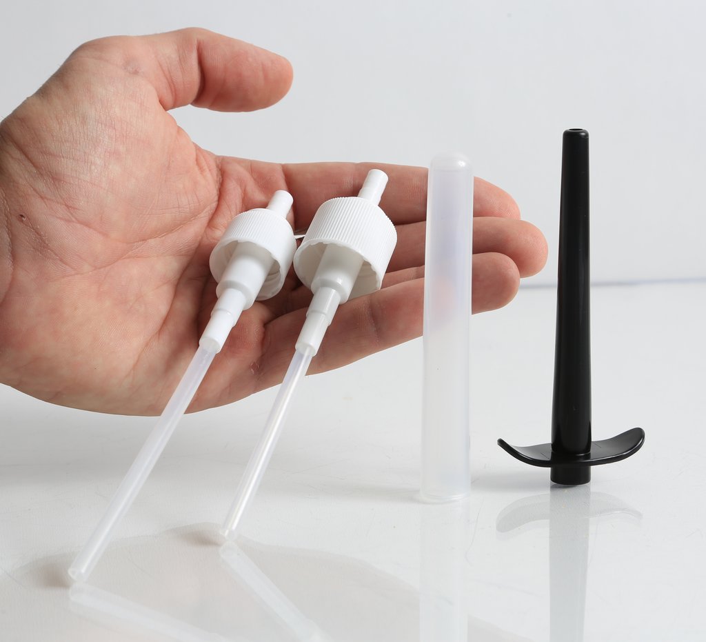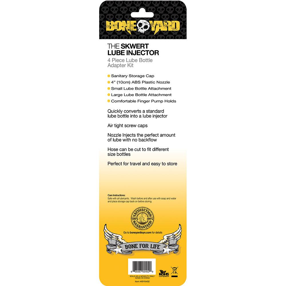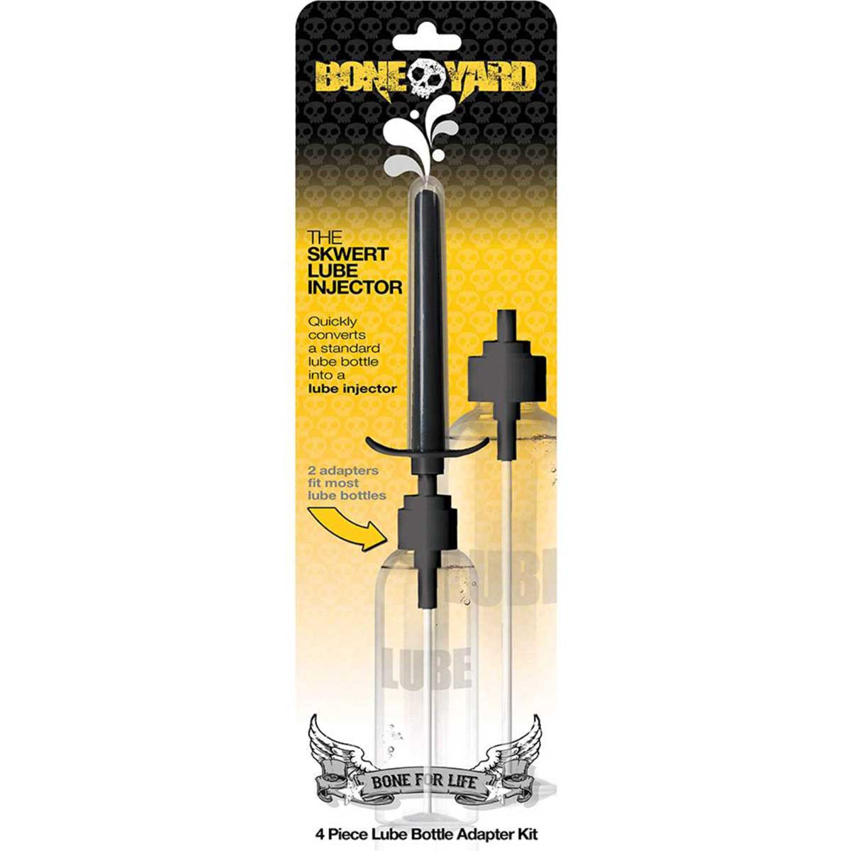 The Skwert Lube Injector quickly converts most lube bottles into a lube injector. Forget those messy syringes, the Skwert Lube Injector makes deep lubrication much easier. The 4” (10cm) interchangeable plastic injector comes with a small and large lube bottle cap. The injector has comfortable finger pump holds, that lets you inject the perfect amount of lubricant with no backflow. The injector also comes with a sanitary storage/travel cap. The hose attachment can be cut to fit multiple size bottles.