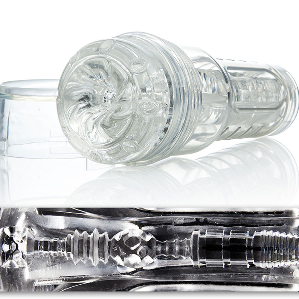 A neutral clear orifice, encased in a clear canister. The modest size of the Fleshlight GO Torque makes it the perfect travel companion