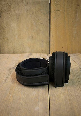 A fully adjustable 11.5 inch strip of neoprene lays against the skin, providing a sense of comfort. On top, they have sewn in a strip of nylon webbing that reinforces the restraint and securely holds a 1.5 inch D ring. Two 7 inch strips of Velcro ‘lock’ the restraint. One underneath and one on top.