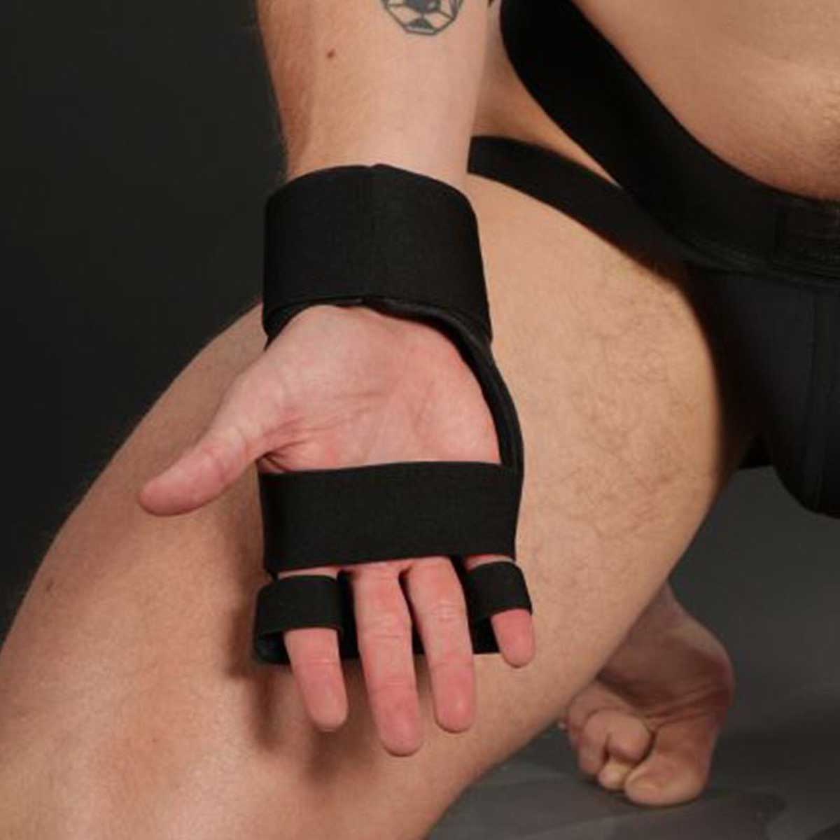 The left side is marked with an L tag. When putting on the glove on your index finger should go into the loop of the slightly curved panel on the left. Your little finger then goes into the elastic loop on the right-hand side. Wrap the elastic wrist strap around twice and secure it with the Velcro loops. Then repeat the process for the right side, using your index finger on the right and little finger on the left.