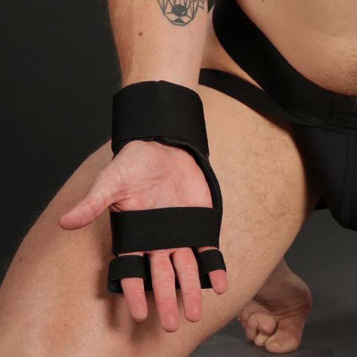 The left side is marked with an L tag. When putting on the glove on your index finger should go into the loop of the slightly curved panel on the left. Your little finger then goes into the elastic loop on the right-hand side. Wrap the elastic wrist strap around twice and secure it with the Velcro loops. Then repeat the process for the right side, using your index finger on the right and little finger on the left.