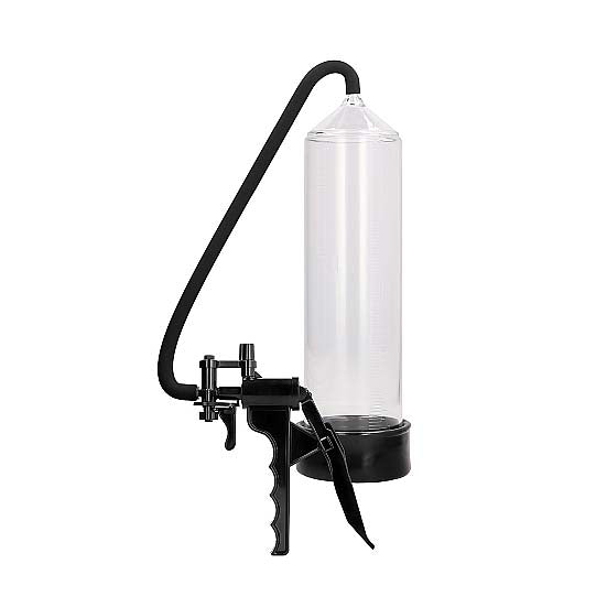 With a total cylinder length of 23cm (9") and a diameter of 6cm (2.35"), this high-quality pump gives you ample possibilities to grow in both directions! The total length of the hose is 25cm (10") and the insertion sleeve is made of smooth Silicone. Surprise yourself every time on how big you can get! There is a transparent version and there are another three different colours to choose from: blue, red or black. This variant comes with a plastic pistol grip pump and a quick release valve for your comfort!
