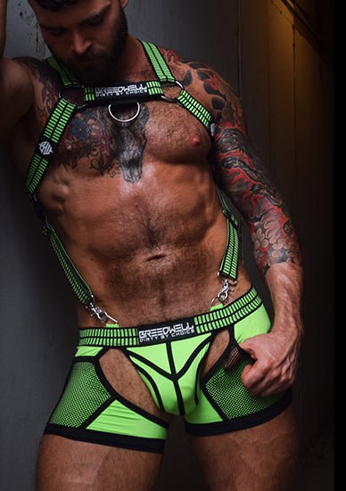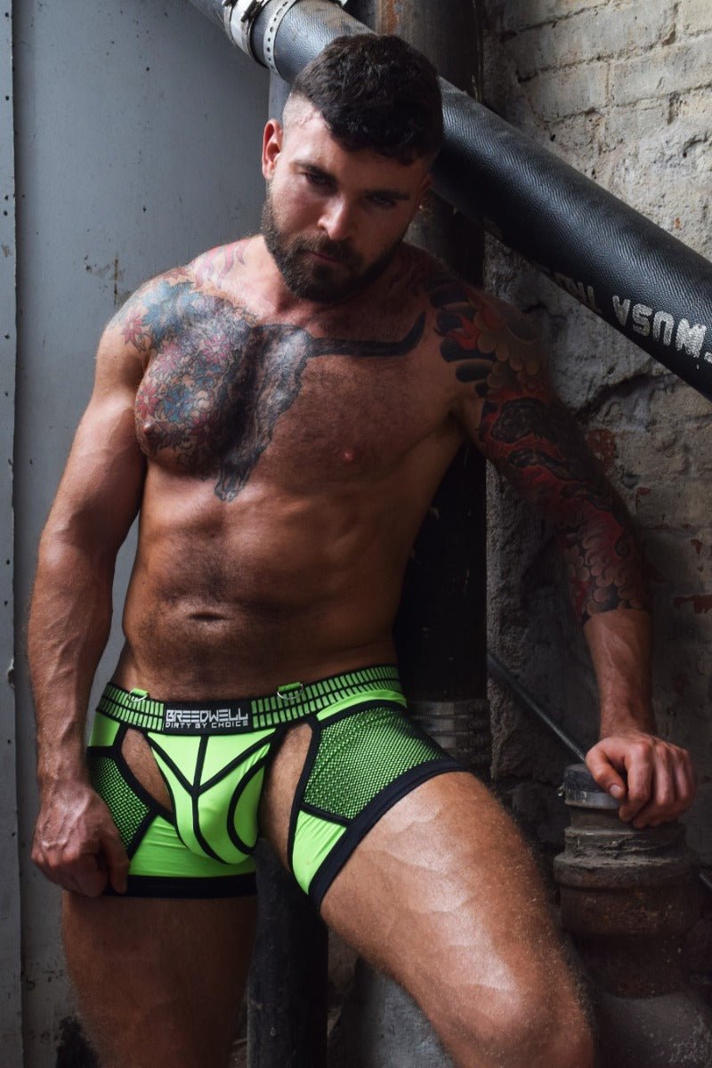 The Breedwell Hybred Chap Jock Green is one of our bestselling fetish items. The perfect combination of chap, short and jock creates a stunning look that will get you noticed wherever you wear it.