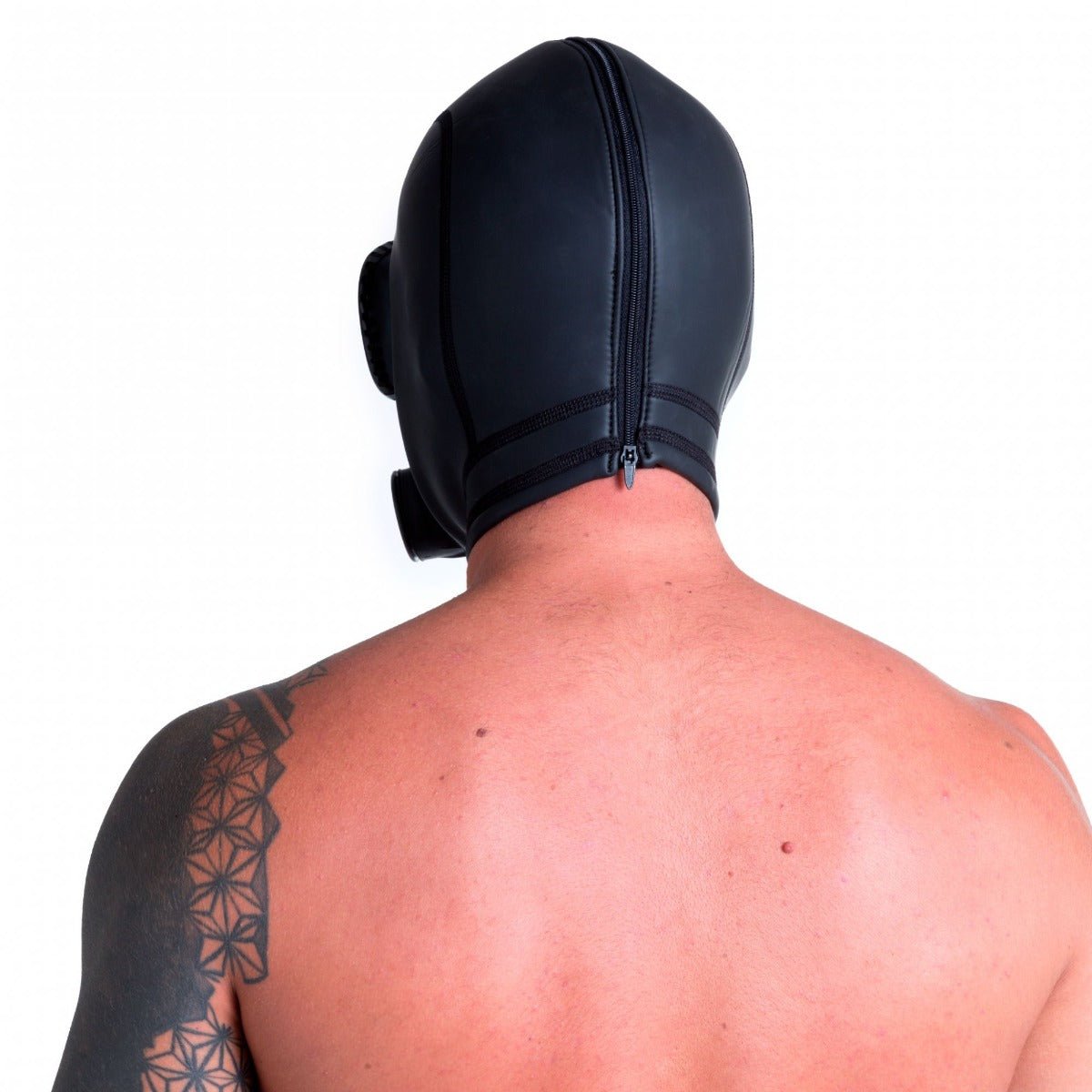 The rear-zip allows for discretion as well as aesthetic, keeping the look and feel of the hood as a whole and allowing complete immersion into this kink play.