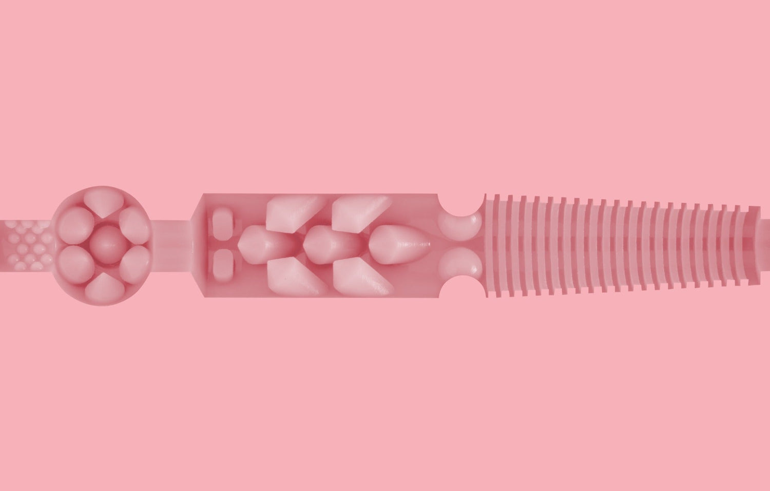 The Destroya begins with three small rings of bumps that grasp your erect penis tightly as you slide inside. A little deeper within, its signature pleasure dome gives you 360 degrees of unmatched bliss. The next chamber starts with a small row of teeth and fangs that delightfully rub and pull at you. Finally, one row of large bumps leads into a super-ribbed texture that narrows the deeper you go.