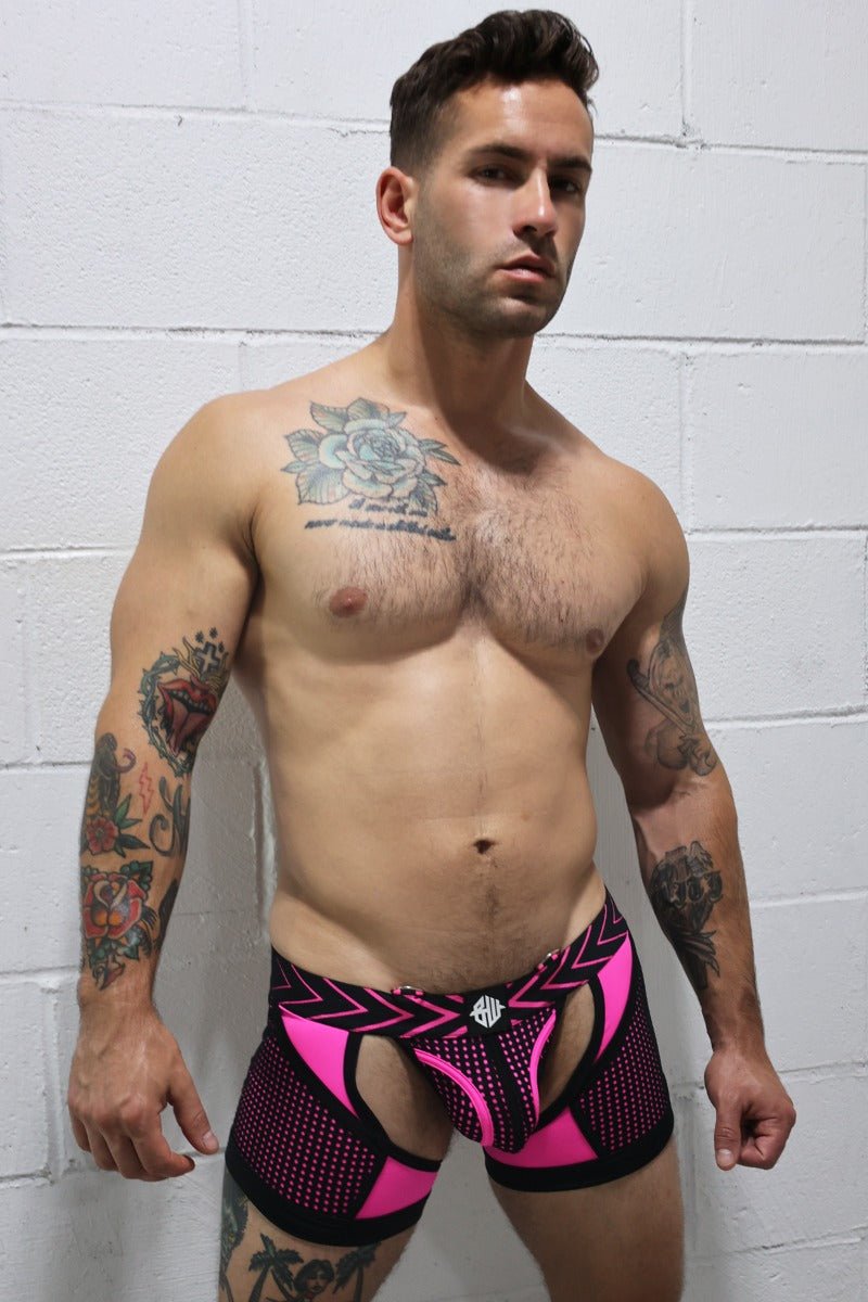 Get the sexiest parts of a jockstrap and short chaps with the Breedwell Dickmatized Chap Jock Neon Pink! Geometric design, mesh shorts for your poppers and a supported pouch for your package make this underwear DICKMATIZING!